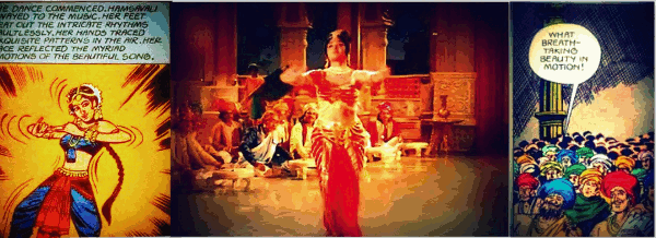 | Vyjayanthimala in Amrapali inserted into a comic panel based on story of Hamsavali from Somadeva’s Kathasaritsagara. Somadeva, son of Brahman Rama, composed the Kathasaritasagara (between 1063 and 1081) for Queen Suryavati, daughter of Indu, the king of Trigarta (Jalandhar). She was the wife of King Anantadeva, who ruled Kashmir in the eleventh century. The story of Suryavati, Ananta, Kalsa and Harsha is perhaps the gruesomest tale from Rajatarangini that ends with Anata killing himself by sitting on a dagger and Suryavati going ablaze. |