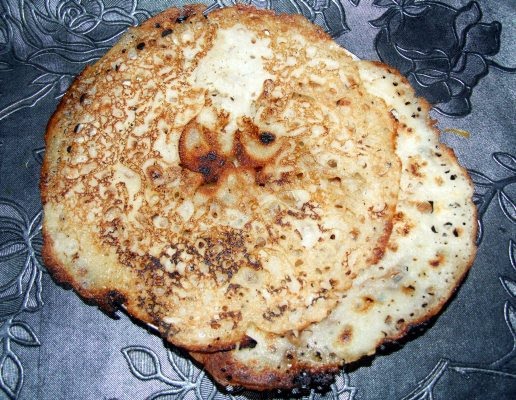 Made from rice flour. Get its name because of the Tchir or sizzling sound that it makes on the tava (or Taaw, in Kashmir) while being prepared. I like to have it in the morning with a cup of Kahwa.