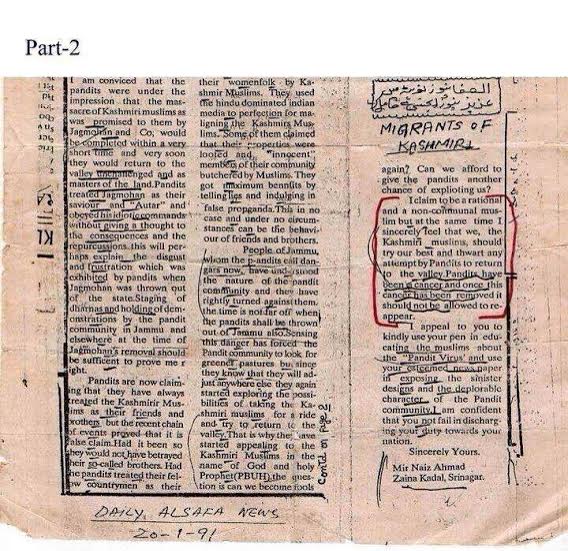 Which reminds me of this sincere letter that was published a local Kashmiri newspaper back in 1991. “thwart any attempt by Pandits to return to the valley. Pandits have been cancer and once this cancer has been removed it should not be allowed to reappear.”