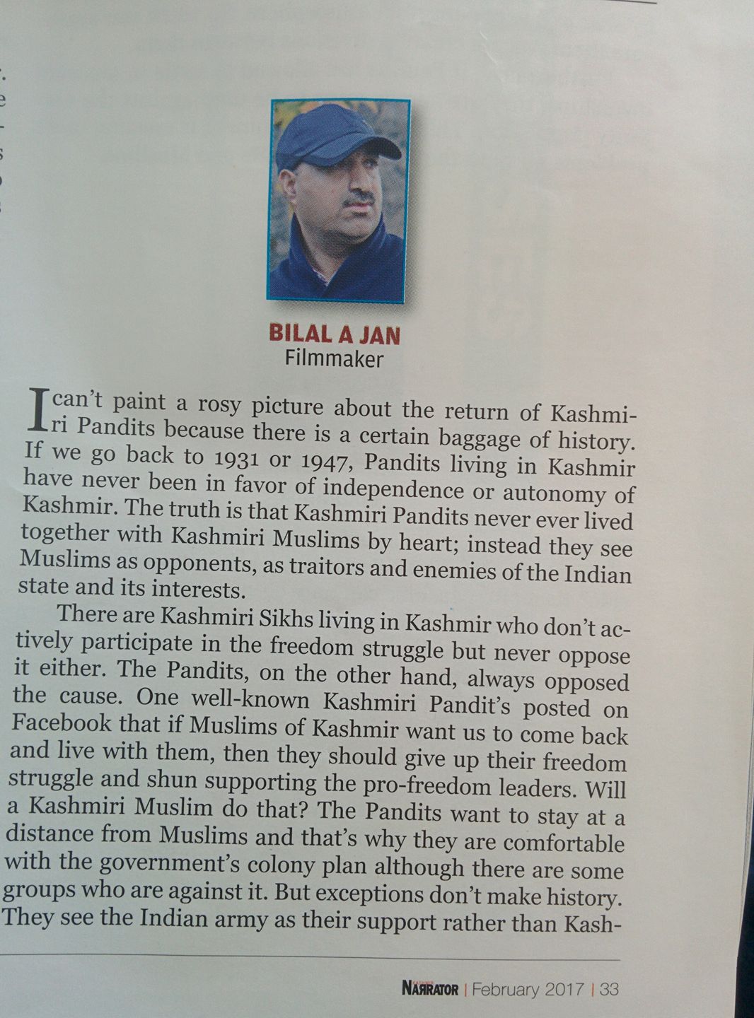 February 2017 issue carries the opinions of the majority community from valley. Among the opinions can be found some interesting dictats with the usual noise about “Kashmir Banega Palestine”, and among those dictats stands out, like a dagger in a bleeding heart, this neurotic piece by a government employee who passes himself off as a Historian.