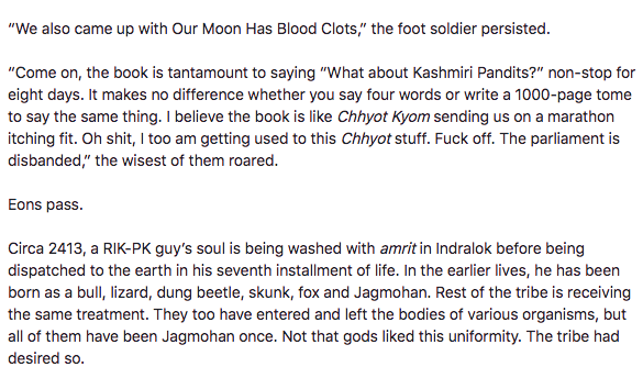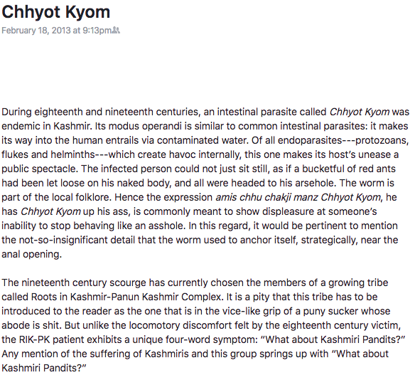 Below is a “sarcastic” response to Rahul Pandita’s book on Pandit exodus “Our Moon has blood clots” where the respected author compares Kashmiri Pandits who talk about their rights to intestinal parasites who just can’t stop scratching the ass.