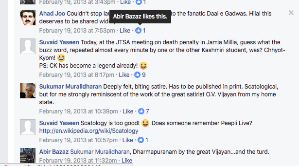 A man from Kerala contextualized it to his liking…he linked it to the satyrical tradition of O. V. Vijayan, a man whose satire took on the high and mighty and not the invisible minority, not the “other” by the “self”. A Kashmiri Muslim version of Vijyan who writes about his own community’s brute majoritarianism and lampooning it, is yet to arrive and even if he existed, would have be in exile like the Kashmiri Pandit community.