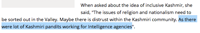 She was promoting her book The Many Faces of Kashmiri Nationalism (2015). While on one hand she likes to sell the idea that Islamic terrorism is an aberration in the Majority community, on the other hand, she claims Kashmiri Pandits were working for intelligence agencies. She does not even say that Majority community assumed that Kashmiri pandits were working for intelligence agencies hence there is a distrust between two, no, she claims “As there were a lot of Kashmiri pandits working for intelligence agencies”.
