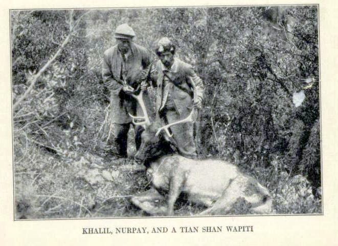 “It would have both interested and amused Father [The American President ] to find our native American name bestowed upon the wapiti’s Asiatic cousin. Our Kashmiri shikaries, getting the name from British sportsmen, referred to the big deer as wapiti. The general native name was boogha, a slight variation, if any, of the name for Yarkand stag. Our Kashmiris called ibex “ibuckus,” and it was as that we usually referred to them. Their native name in the Tian Shan is “tikka.” Siberian roe is known as “illik,” and when Rahima first talked of it we believed that he was Kashmirizing elk and was speaking about the wapiti.”