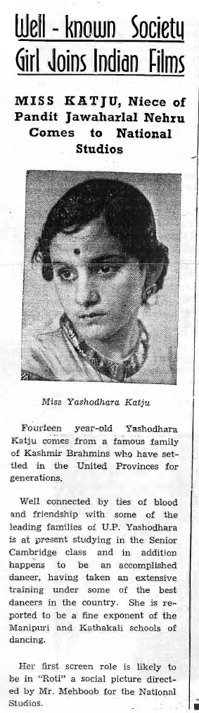 In 1941 when Pandit Nehru’s young niece decided to join the film industry not only did Yashodhara Katju become the first Kashmiri heroine of silver screen but perhaps one of the first woman from a good family to set foot in the not so good film industry – an event that was certainly newsworthy.